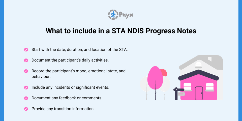 Therefore, NDIS progress notes for STA are not solely about the participant's progress; instead, they're about how the participant's behaviour adjusted to the new environment. Specifically, how the participant interacts with others (if they live in a group setting) and manage their daily routines in a different setting.